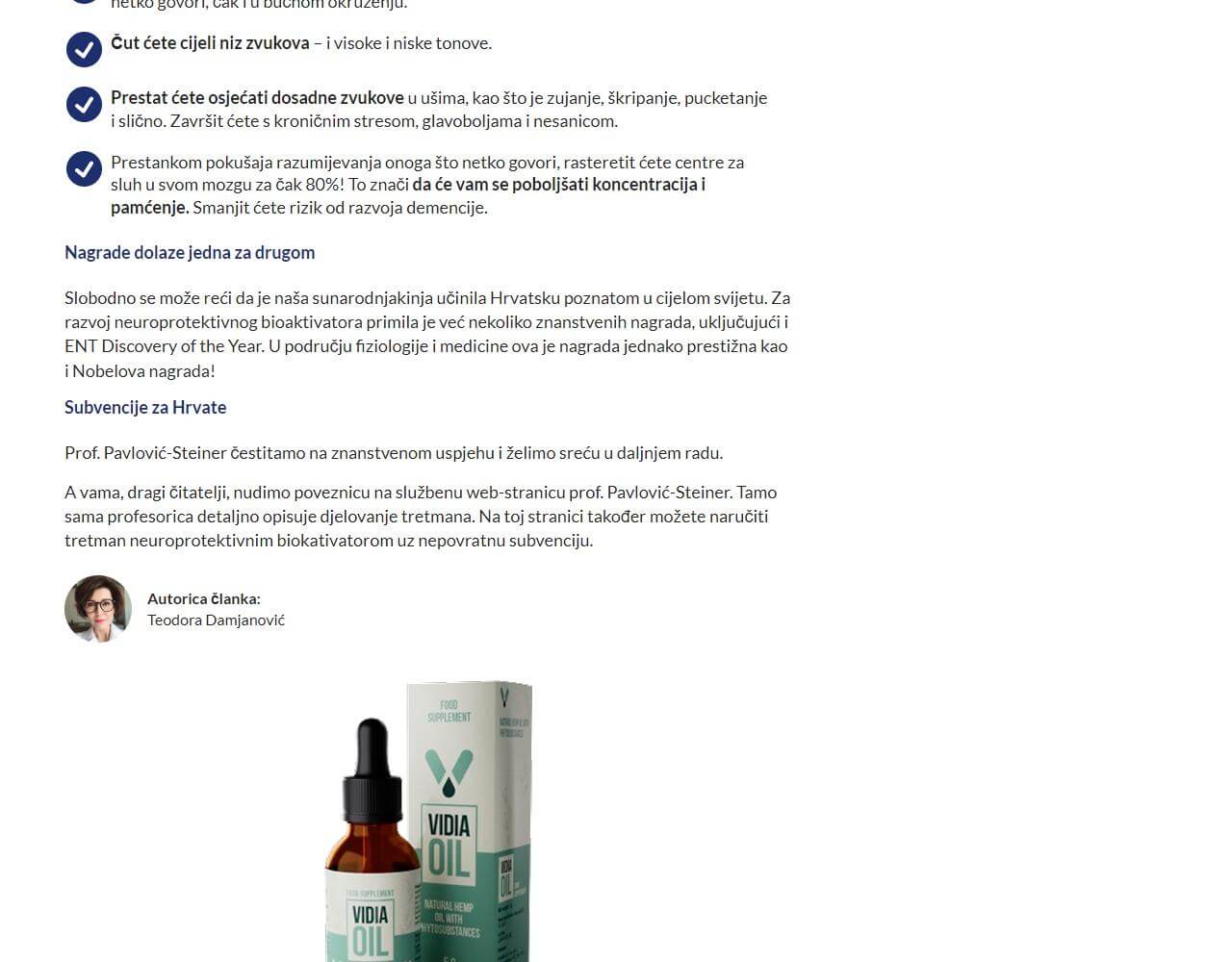 - Brzo uklanjanje simptoma. Vidia Oil ima trenutni učinak na uklanjanje boli u ušima, tjedan dana ublažava zvonjenje, svrbež, stagnaciju, prometne gužve.